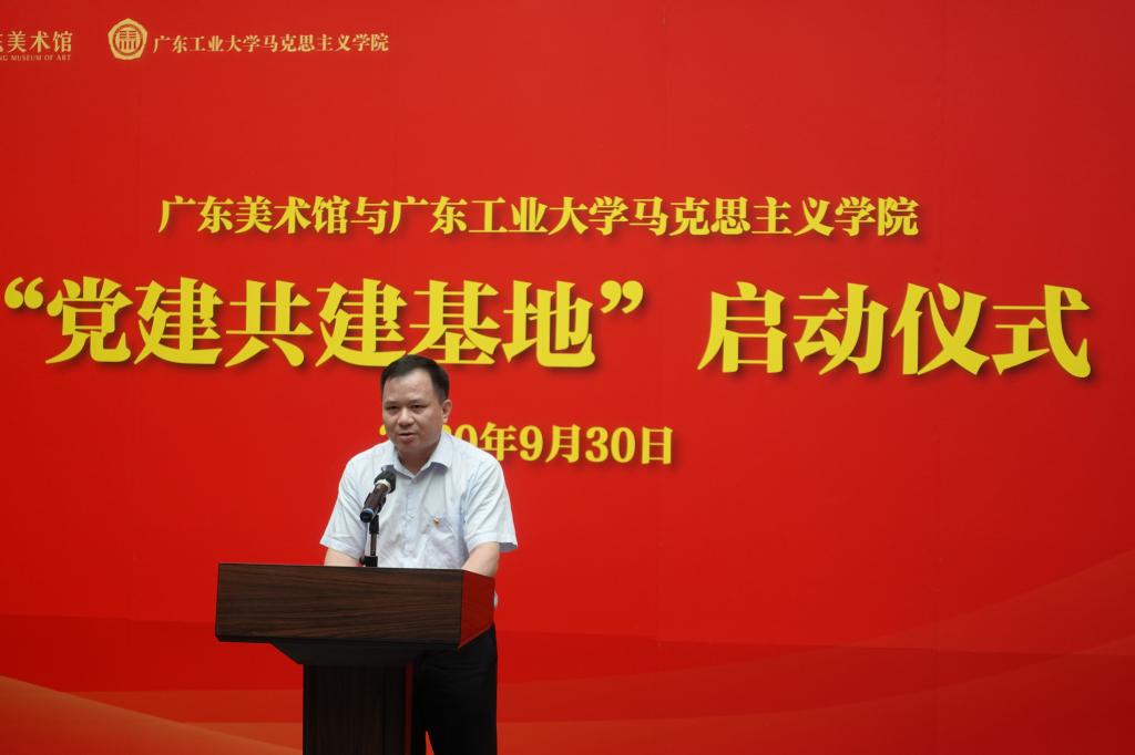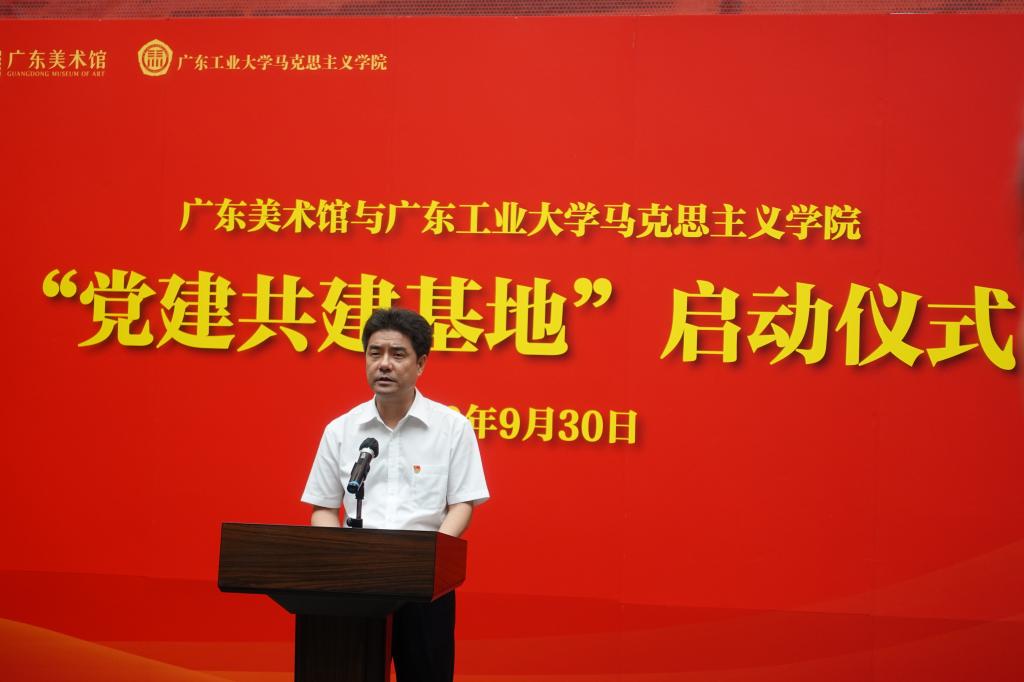 本网讯 9月30日下午,广工马克思主义学院与广东美术馆“党建共建基地”启动仪式在广东美术馆一楼大厅举行。广东省文化和旅游厅党组成员、副厅长张奕民,广工党委书记胡钦太,广东美术馆党支部书记、馆长王绍强,广东美术馆全体在职党员、入党积极分子,广工党委组织部、党委宣传部、马克思主义学院党总支党员干部教师代表,艺术与设计学院教师学生代表参加了启动仪式。