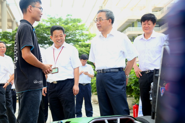 胡春华调研期间参观了微电子精密制造与装备教育部重点实验室、广州国家现代服务业集成电路设计产业化基地,观看了我校学生FASE赛车、“挑战杯”国赛一等奖作品无人机表演等,并主持座谈会,听取了学校关于推进建设高水平大学的工作汇报。
