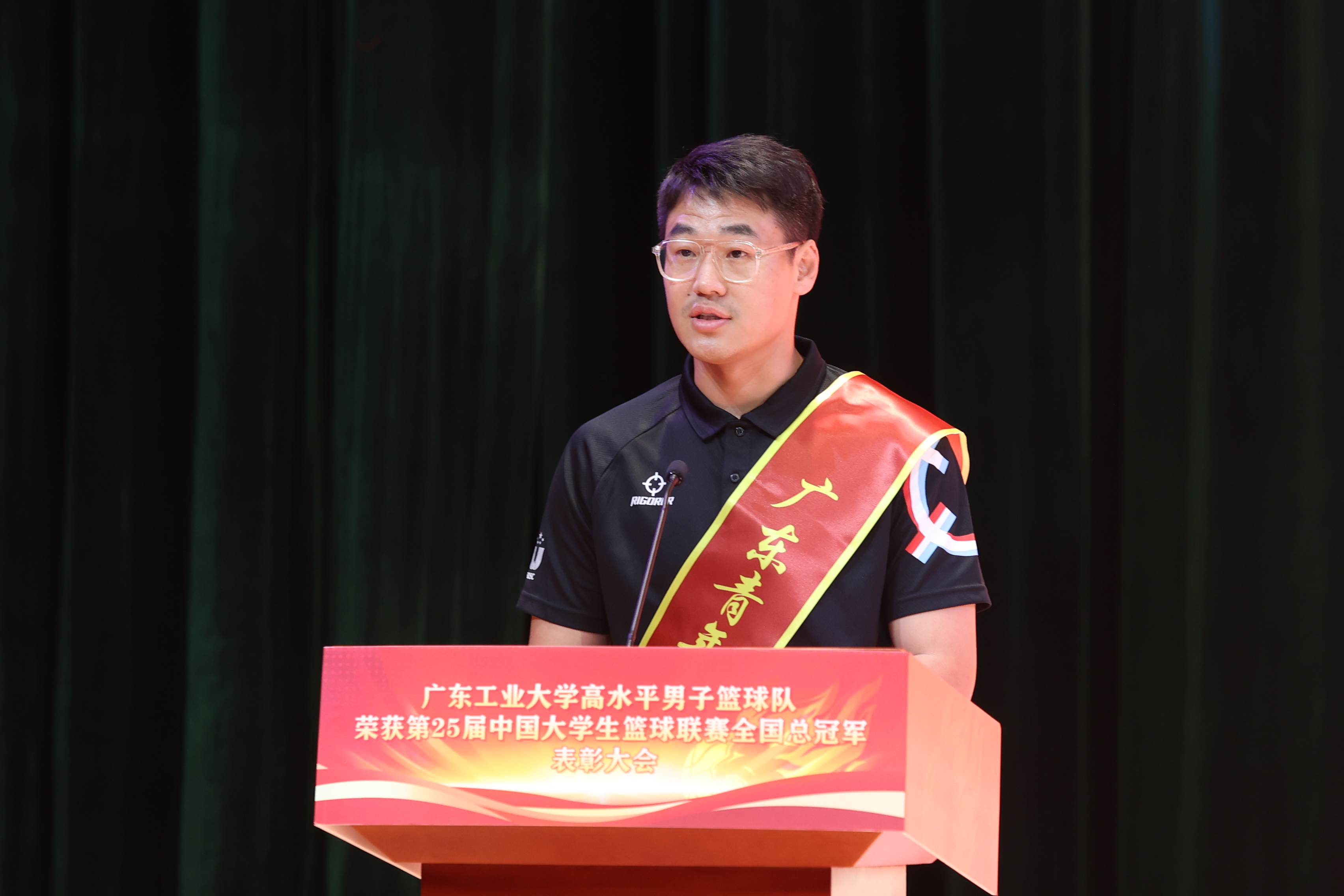 邱学青宣读学校《关于表彰高水平男子篮球队的决定》。学校男篮是新时代广工青年集体的优秀代表。他们展现了脚踏实地、笃行不怠的实干品格,迎难而上、追求卓越的拼搏精神,敢于胜利、为校争光的进取特质,以强烈的历史主动精神寻求突破和超越。为弘扬学校男篮精神,经学校研究决定,授予广工男子篮球队“星空注册先进集体”称号。学校希望全体师生以男子篮球队为榜样,踔厉奋发、勇攀高峰,为全面推进高水平创新型大学建设作出新的更大贡献,为全面建设社会主义现代化国家、全面推进中华民族伟大复兴而团结奋斗。
