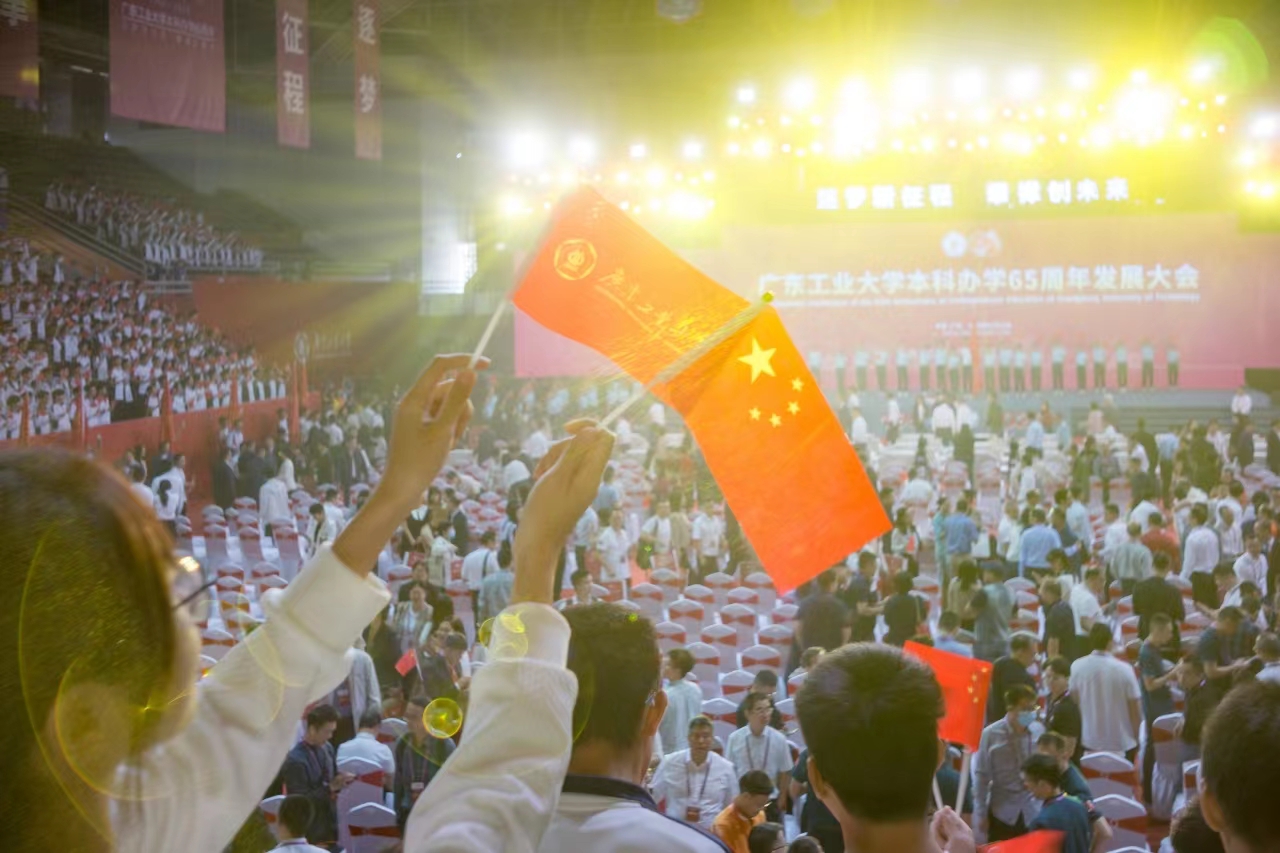 迎来65岁华诞的广工校园处处洋溢着喜庆氛围,焕发着勃勃生机;“祝母校65周岁生日快乐!”体育馆内,大屏幕播放着来自各地校友会、校友代表和海内外友人的祝福视频;舞台上传来耳熟能详的歌声,青春飞扬的广工学子高唱《有我》《红日》《挑战在路上》等曲目为大会暖场。大会播放星空注册本科办学65周年宣传片《逐梦》,与会人员共同忆往昔、看今朝、望未来。
