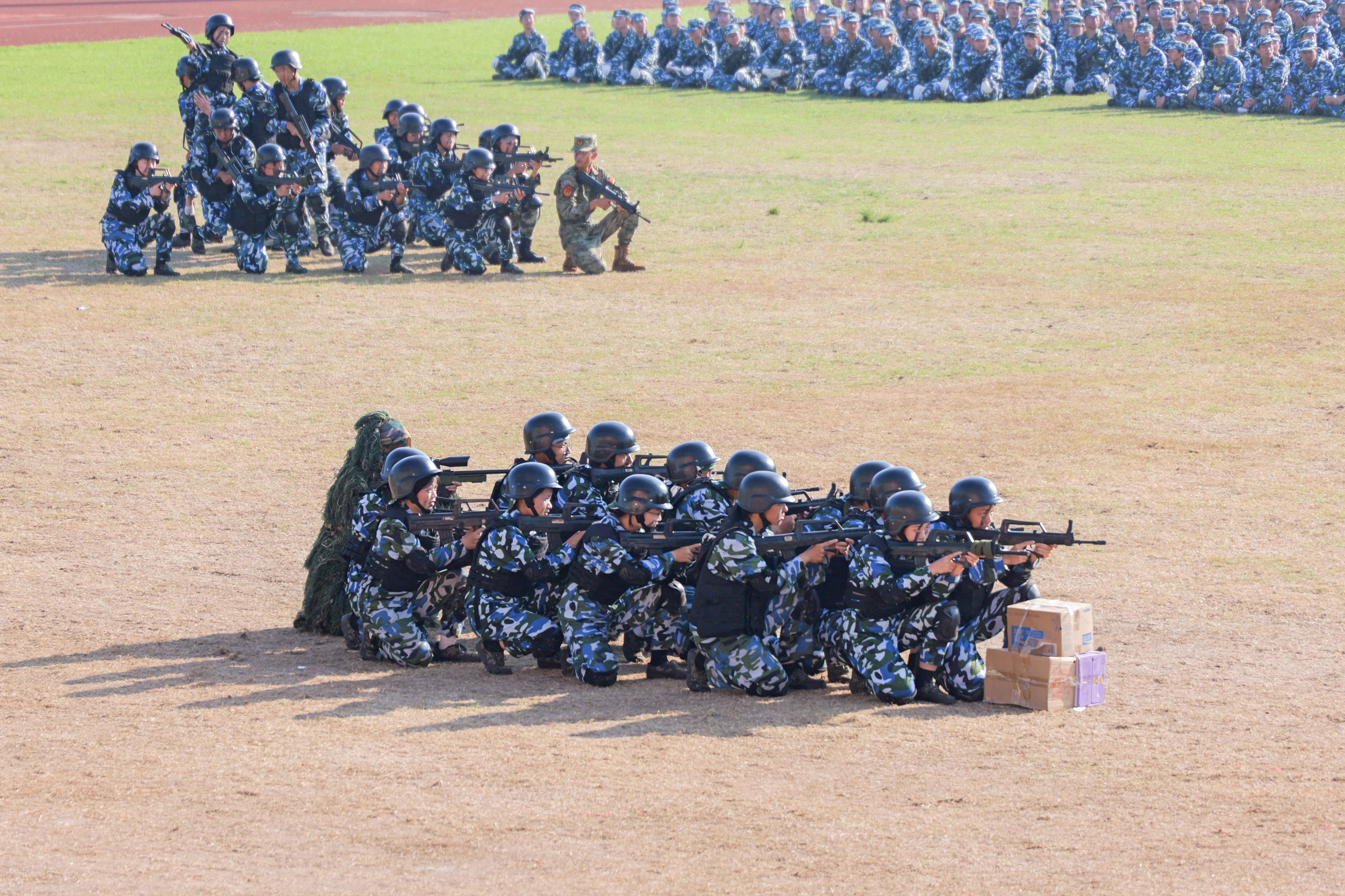 分列式及军事特色科目汇报中,同学们士气高昂、口号响亮、步伐矫健、队列整齐。军体拳、匕首操、短棍术、应急长棍……同学们眼神坚定、身姿矫健、口号铿锵,少年的热血与军魂,在此刻完美融合。军体拳中无惧烈日的坚毅,匕首操中铁血与柔情的结合,旗语方队有力的挥旗……每一个科目都是对他们努力与拼搏的最佳呈现。现场气氛热火朝天,男儿的铿锵斗志和女兵的巾帼风采赢得师生们阵阵掌声。