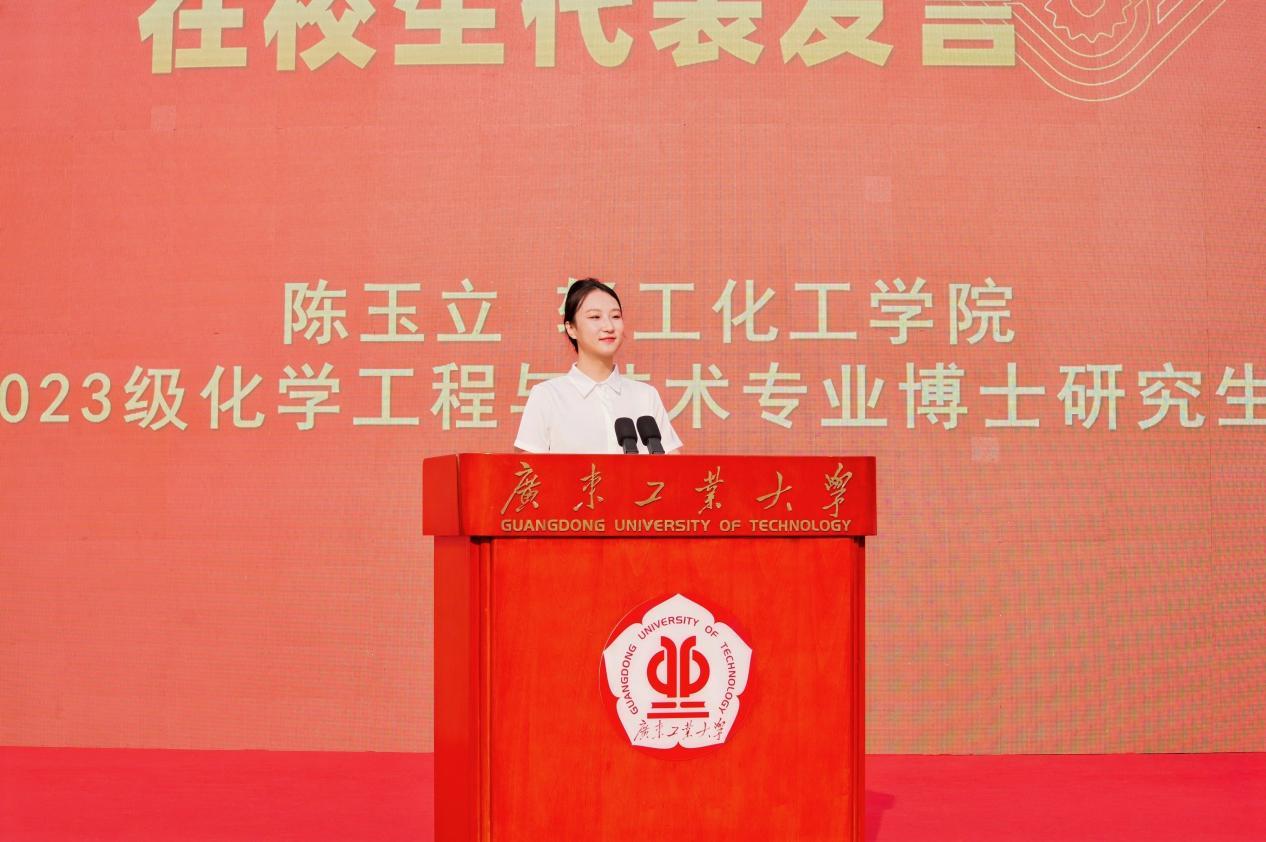 轻工化工学院博士研究生陈玉立分享了自己的求学历程,感恩广工赋予的博士研究生与广州氢天科技创始人的双重身份,使自己真正蜕变成为科研的“攀撑者”。他鼓励师弟师妹携手前行,“无数平凡的进步终将汇聚成广工人科创报国的奔流江河。”
