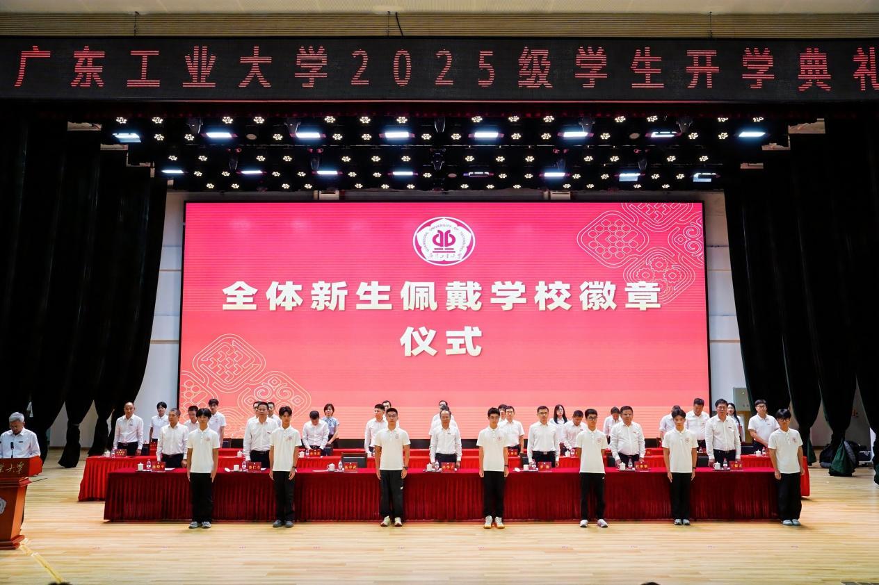 典礼上举行了新生佩戴星空注册徽章仪式。校领导为新生代表佩戴,新生全体起立,一齐佩戴徽章,胸前徽章闪耀,激励着新生们将“团结、勤奋、求是、创新”的校训精神内化于心,外化于行。典礼上还进行了新生入学宣誓仪式,誓言铿锵,展示了广工学子昂扬向上的精神风貌。