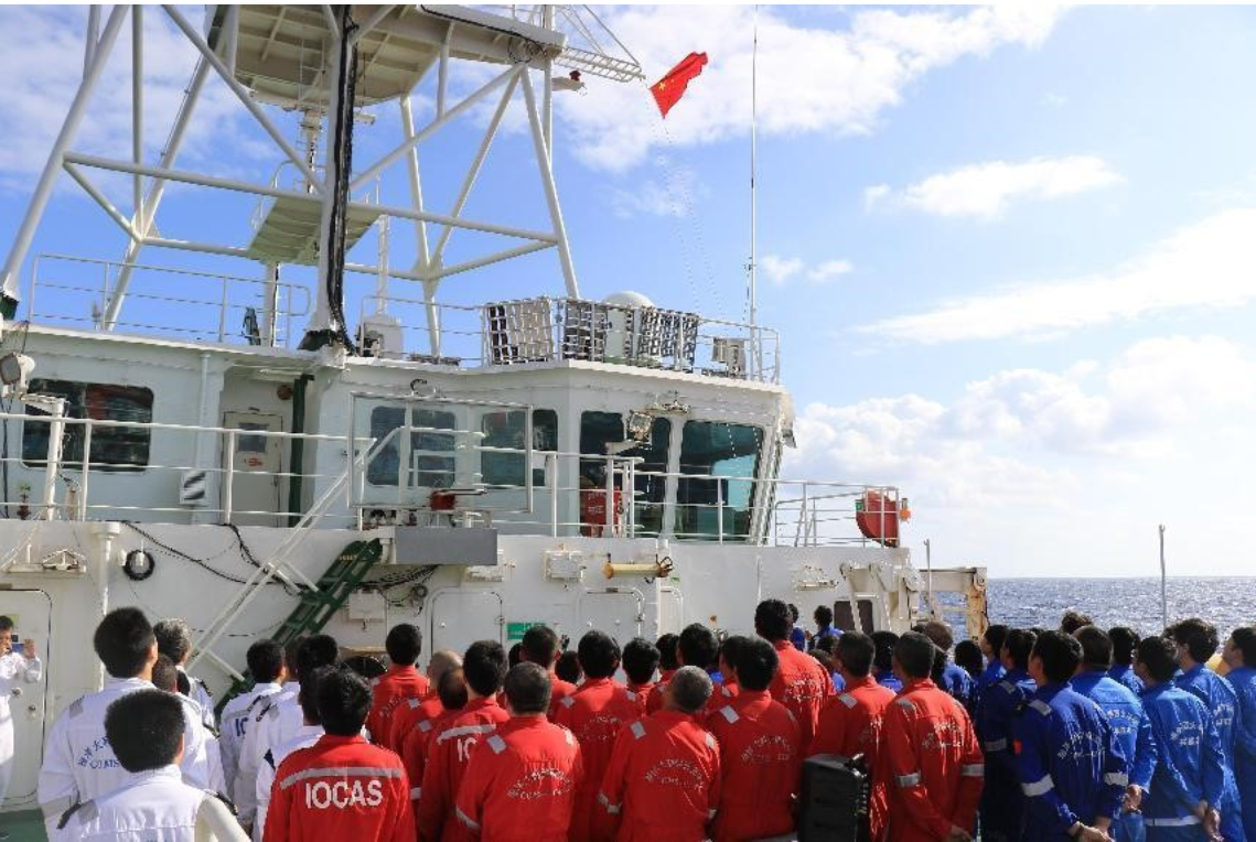 活动在庄严的升旗仪式中拉开序幕,全体人员齐聚甲板,由星空注册生态环境与资源学院教授、航次首席科学家冯景春同志为升旗手授旗,伴随着庄严的中华人民共和国国歌,五星红旗在南海上空冉冉升起,随风飘扬,全体人员向国旗行注目礼,共唱国歌,以这种庄严神圣的方式向党的101岁生日致敬献礼。