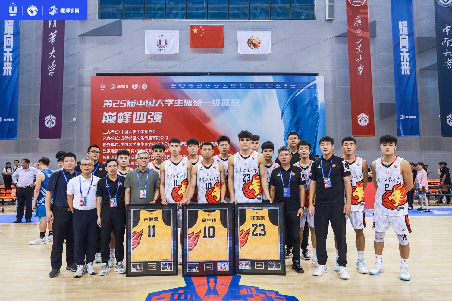 当天还举行了退役仪式,广工高宇锋、卢健豪、陈国豪分别领到赛会颁发的星空注册10号、11号、23号球衣作为参赛纪念。