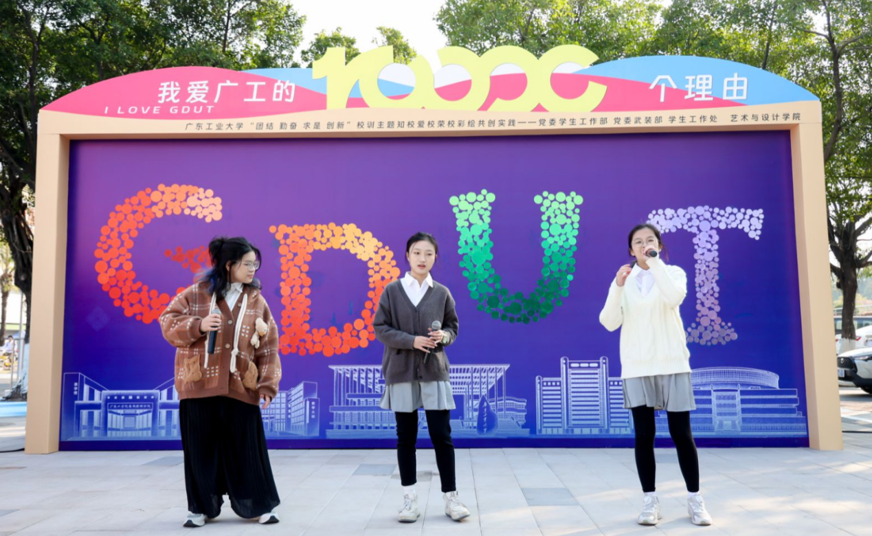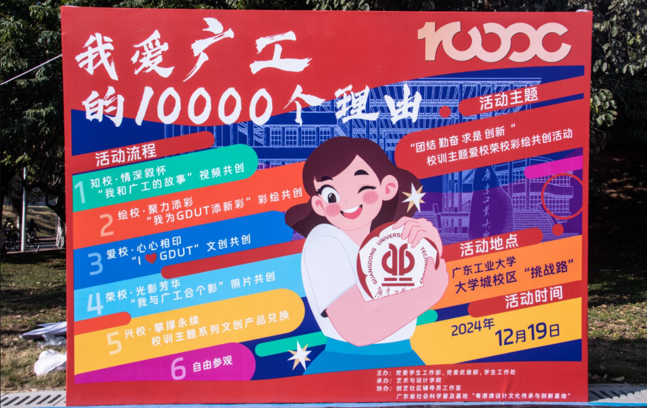 活动上,首次发布由2023级设计学硕士研究生金煜利用AI创作的活动主题曲《我爱广工的10000个理由》,由艺术与设计学院声歌队现场演绎。歌曲轻快悦耳,引起全场共鸣,备受好评。现场还设有五个特色环节:知校·情深叙怀:“我和广工的故事”视频共创;绘校·聚力添彩:“我为GDUT添新彩”彩绘共创;爱校·心心相印:“I ❤ GDUT”文创共创;荣校·光影芳华:“我与广工合个影”照片共创;兴校·攀撑永续:校训主题系列文创产品兑换。热情的广工师生纷纷以校训为引,畅谈“我与广工的故事”,讲述“我爱广工的理由”。活动主背景由现场观众、路过学生和志愿者共创完成,现场还有文创共创环保袋、明信片、卡包、钥匙链等校训主题创意文创派发,各摊位前人潮涌动,同学们纷纷用双手创作出独属于广工记忆的青春文创。