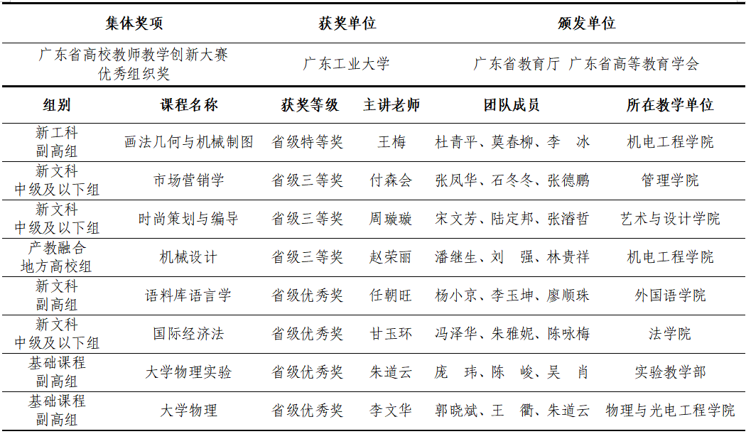 近日,第五届全国高校教师教学创新大赛广东分赛暨广东省高校教师教学创新大赛获奖名单公布,广工在大赛中取得佳绩,共斩获9项省级荣誉,其中特等奖1项,三等奖3项,优秀奖4项,优秀组织奖1项。