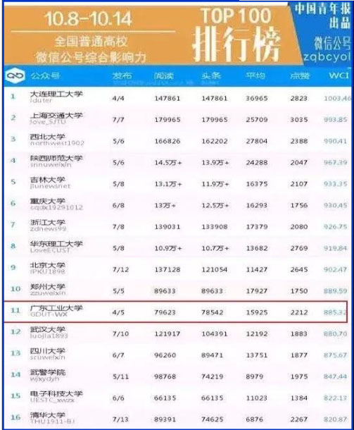 高校官方微信公众号已成为一所大学传递信息、凝聚情感的重要渠道,其影响力不容小觑。为评估全国各高校官方微信公众号影响力,从2014年11月17日开始,中国青年报每周一推出全国高校的微信公众号综合影响力排行榜以及相应的文章阅读量排行榜。