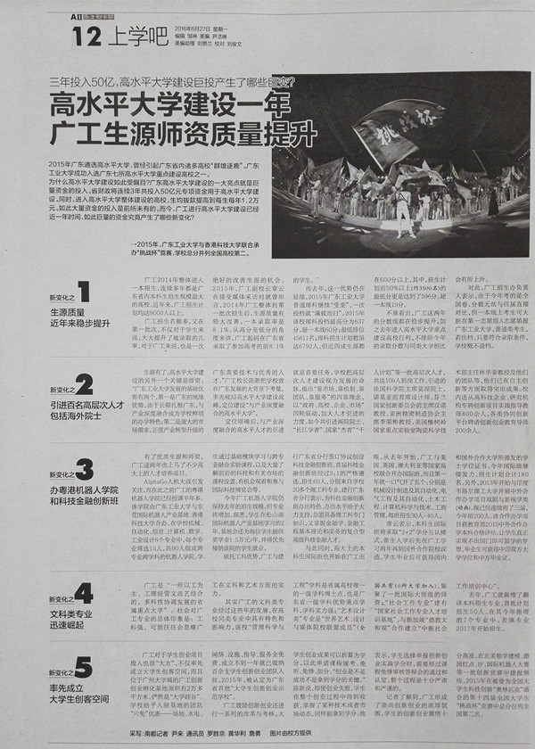 为什么高水平大学建设如此受瞩目?广东高水平大学建设的一大亮点就是巨量资金的投入。省财政将连续3年共投入50亿元专项资金用于高水平大学建设。同时,进入高水平大学整体建设的高校,生均拨款提高到每生每年1.2万元。如此大量资金的投入是前所未有的。而今,广工进行高水平大学建设已经近一年时间,如此巨量的资金究竟产生了哪些新变化?