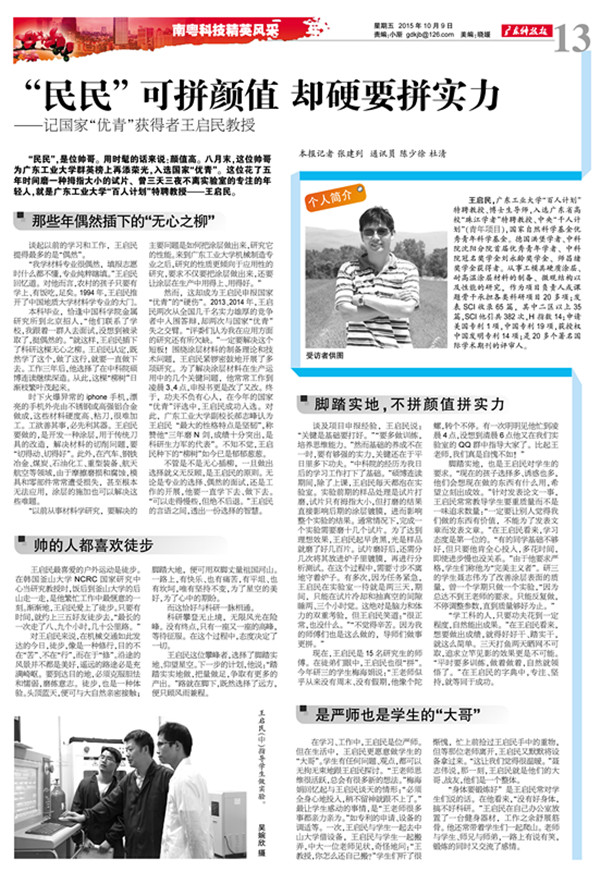 “民民”,是位帅哥。用时髦的话来说:颜值高。这位花了五年时间磨一种拇指大小的试片、曾三天三夜不离实验室的专注的年轻人,就是星空注册“百人计划”特聘教授——王启民。