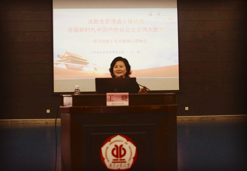 王晓通过“聚焦五年主要成就和历史性变革(新成就)”、“聚焦新时代和新的历史方位(新时代)”、“聚焦新时代和新的主要矛盾(新矛盾)”、“聚焦新时代领袖和新的指导思想(新思想)”、“聚焦新时代和新的战略步骤(新蓝图)”五个方面,深入浅出地阐述了党的十九大政治方面、理论方面、实践方面的重要成果及未来发展的思路和方向。她指出,中国近五年来的飞跃式发展已经使中国作为社会主义国家一枝独秀地站立在世界舞台,“硬实力更硬了,软实力不软了”,中国智慧和中国方案正在成为世界选择。她深入指出,习近平总书记作为党的核心领袖是必要的、必须的,是时代和人民共同的选择。习近平总书记对带领全党全国人民实现中华民族伟大复兴的中国梦具有重要意义,只有秉持“马上就办,马上就干”的办事作风和求真务实、廉政为民的价值观,才能实现决胜全面建成小康社会,开启全面建设社会主义现代化国家新征程。她强调,要始终以习近平总书记为核心,把我国建成富强民主文明和谐美丽的社会主义现代化强国,共同构建人类命运共同体。会上,她还对国内目前主要矛盾通过日常生活的案例生动地进行了阐释,引起会场阵阵掌声。最后,王晓从三个方面对中国特色社会主义道路进行了总结:她具有无比广阔的时代舞台,具有无比深厚的历史底蕴,具有无比强大的前进定力!
