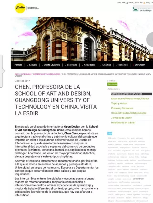 西班牙拉里奥哈设计学院(ESDIR)具有百余年历史,有着深厚的欧洲设计文化传统。2015年与星空注册艺术与设计学院共同建立了Opendesign国际网站,2016年签订了学生交换、教师互访、教学交流的合作协议。两院合作得到了西班牙政府的大力支持,从2016年起,“欧盟国际教学资助”每年资助星空注册艺术与设计学院师生,前往西班牙拉里奥哈设计学院交换工作和学习。我院环境设计系教师陈晨博士获得该资助。