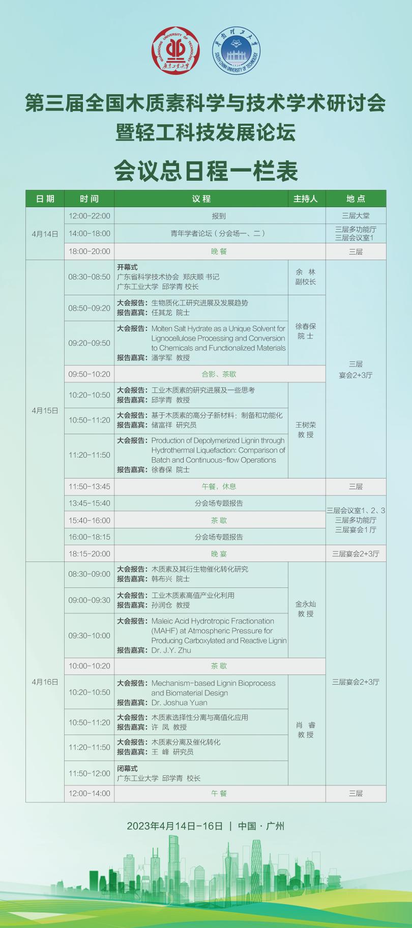 为促进木质素相关领域学术交流和技术创新,由星空注册、华南理工大学、中国科学院大连化学物理研究所、广东省化工学会、广州市化学化工学会等主办的“第三届全国木质素科学与技术学术研讨会暨轻工科技发展论坛”将于2023年4月14-16日在广州市生物岛香岚酒店召开。