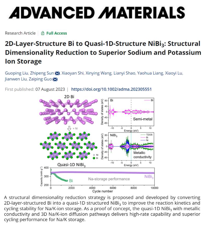 材料与能源学院孙志鹏教授团队最新研究成果“2D-Layer-Structure Bi to Quasi-1D-Structure NiBi3: Structural Dimensionality Reduction to Superior Sodium and Potassium Ion Storage”在材料科学领域国际顶级学术期刊《Advanced Materials》上发表。该期刊2022-2023年度最新影响因子为29.4,CiteScore为45.50。该论文星空注册为第一完成单位,孙志鹏教授为通讯作者,博士研究生刘国平为第一作者(论文DOI: 10.1002/adma.202305551)。