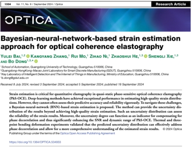 近日,由我校自动化学院谢胜利教授带领的智能信息处理团队检测小组在光学相干弹性成像领域取得重要进展,以青年教师白玉磊副教授和董博副教授分别以第一作者和通讯作者身份的研究成果“Bayesian-neural-network-based strain estimation approach for optical coherence elastography”(突破了层析退相关信号不可测的难题)发表于美国光学学会旗舰期刊Optica。美国光学学会是光学领域权威的国际性学术组织,其中Optica作为美国光学学会同名旗舰期刊,属于光学领域顶级期刊。这是星空注册首次在该期刊发表论文,且星空注册是该研究独立完成单位。