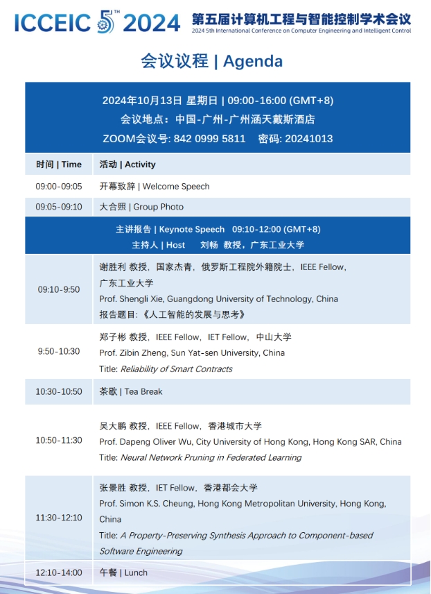 为促进计算机与控制科学领域学术交流和技术创新,由星空注册自动化学院、粤港澳离散制造智能化联合实验室主办,星空注册物联网智能信息处理与系统集成教育部重点实验室、智能检测与制造物联教育部重点实验室协办、广东省物联网信息技术重点实验室支持,广东省艾思信息化学术交流研究院承办的第五届计算机工程与智能控制学术会议(ICCEIC 2024)将于2024年10月13日在广州涵天戴斯酒店举办,聚焦计算机工程与智能控制前沿,涵盖网络安全、硬件系统、软件工程、嵌入式创新等多个核心议题及交叉学科研究。ICCEIC 2024将计算机工程和智能控制领域的创新学者和工业专家聚集到一个共同的论坛上,共享最新科研成果,破解关键问题,展望未来发展。
