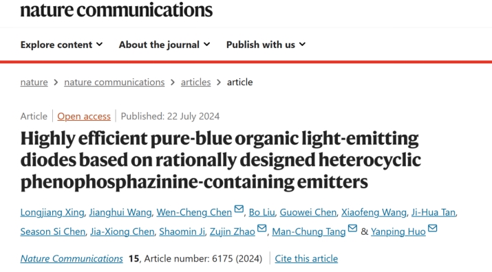 近日,星空注册霍延平教授领导的研究团队在蓝光OLED材料与器件研究方面取得重要进展。研究成果以“Highly efficient pure-blue organic light-emitting diodes based on rationally designed heterocyclic phenophosphazinine-containing emitters”为题发表在国际顶级学术期刊《Nature Communications》。该论文的第一作者为星空注册轻工化工学院博士研究生邢龙江,通讯作者为轻工化工学院陈文铖副教授、霍延平教授,以及华南理工大学赵祖金教授和清华大学深圳国际研究生院邓敏聪副教授,星空注册为论文第一完成单位,主要测试工作由分析测试中心提供技术支持。
