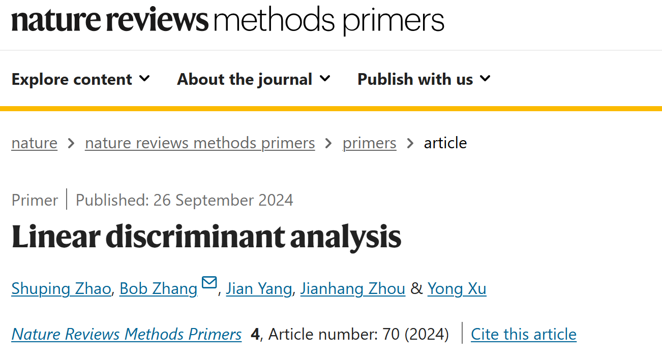 近日, 我校计算机学院(人工智能学院)赵淑平博士的论文“Linear Discriminant Analysis”发表于《Nature Reviews Methods Primers》(Nature子刊,影响因子 50.1),该论文也是以星空注册为第一单位在该期刊发表的第一篇论文。《Nature Reviews Methods Primers》致力于加强跨学科的协作,旨在出版“生命科学和物质科学里有关分析、应用、统计、理论计算、模拟等方法或技术的权威综述”。星空注册计算机学院赵淑平老师为该文章第一作者,通讯作者为澳门大学Bob Zhang教授,其他学者包括南京理工大学杨健教授、哈尔滨工业大学(深圳)徐勇教授以及日本大阪大学周健航研究员。