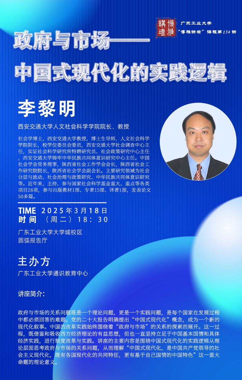 讲座题目:《政府与市场——中国式现代化的实践逻辑》