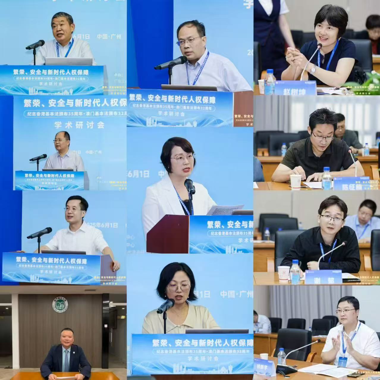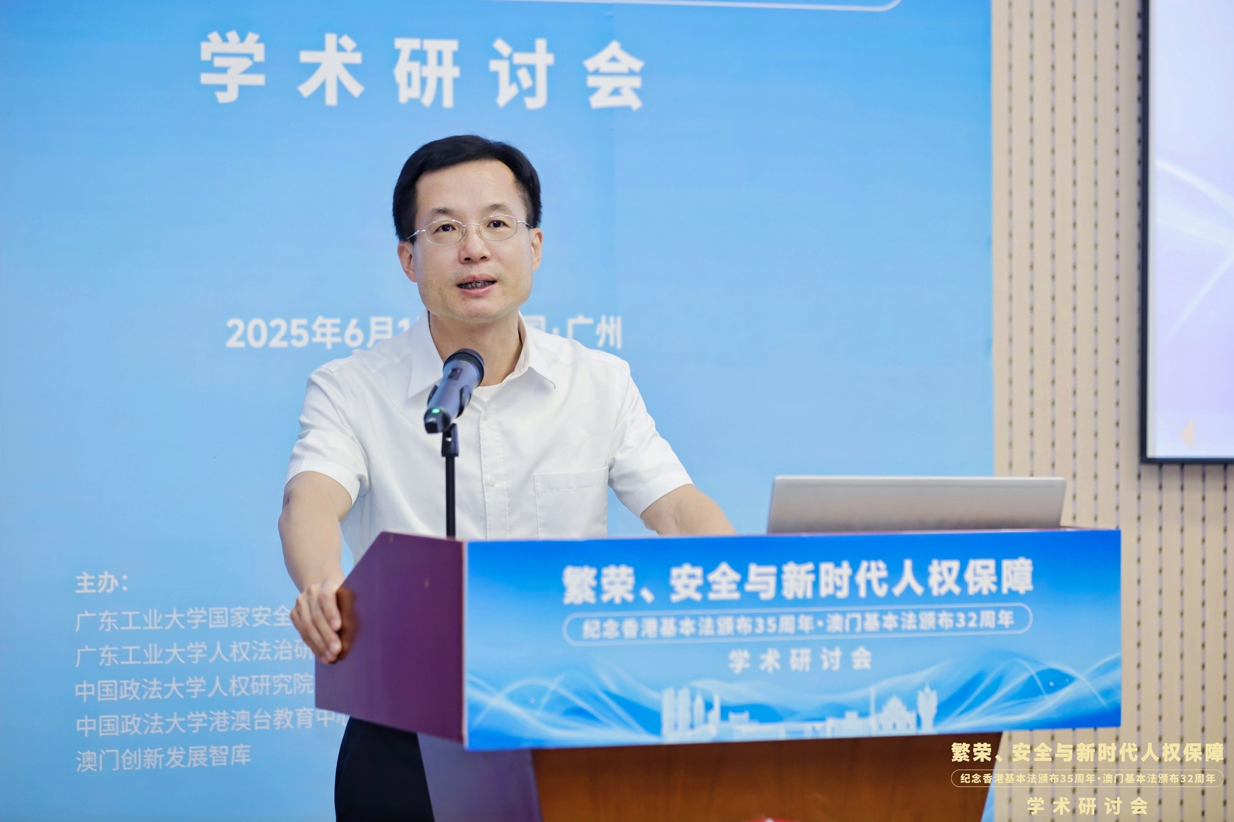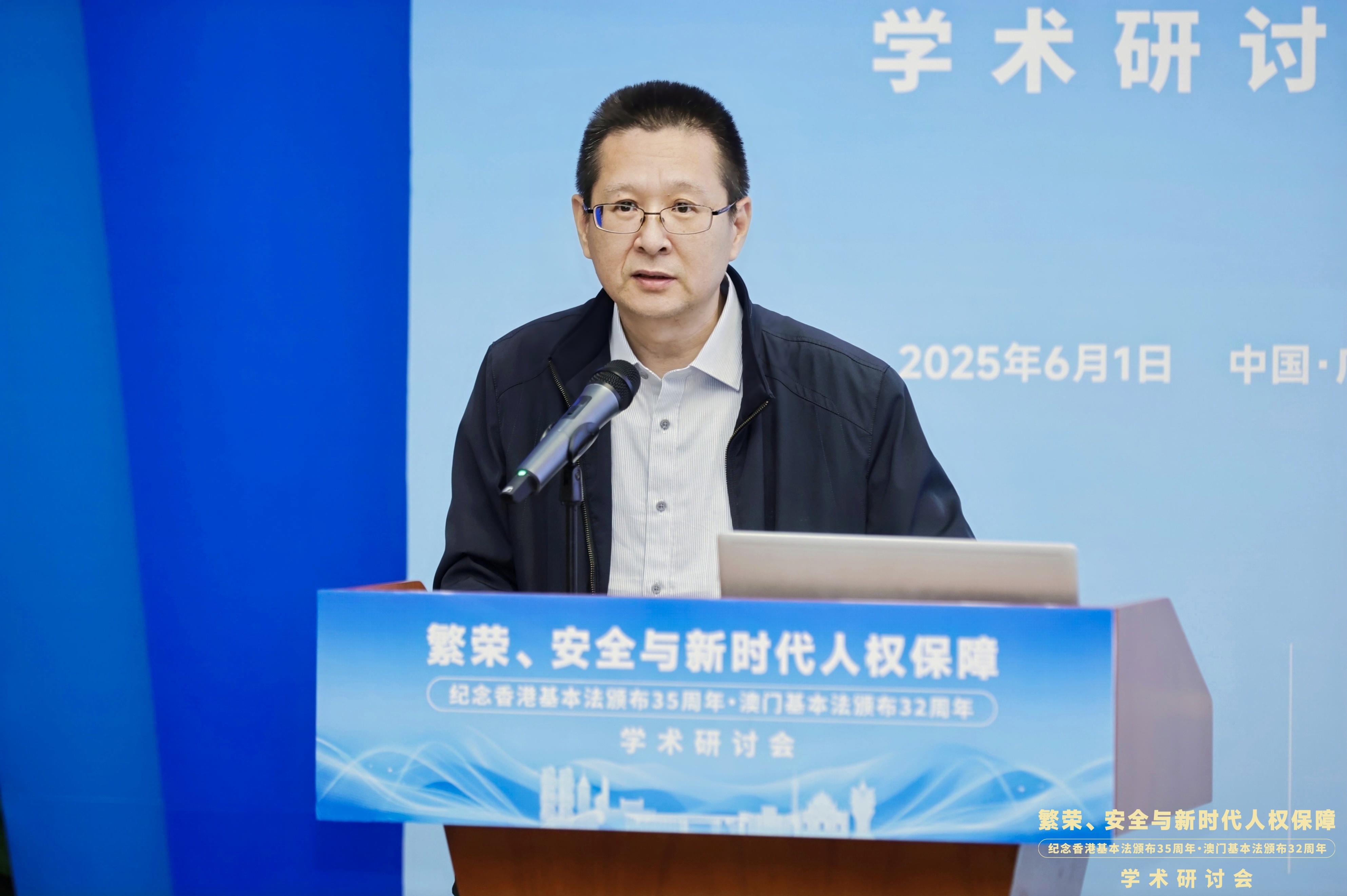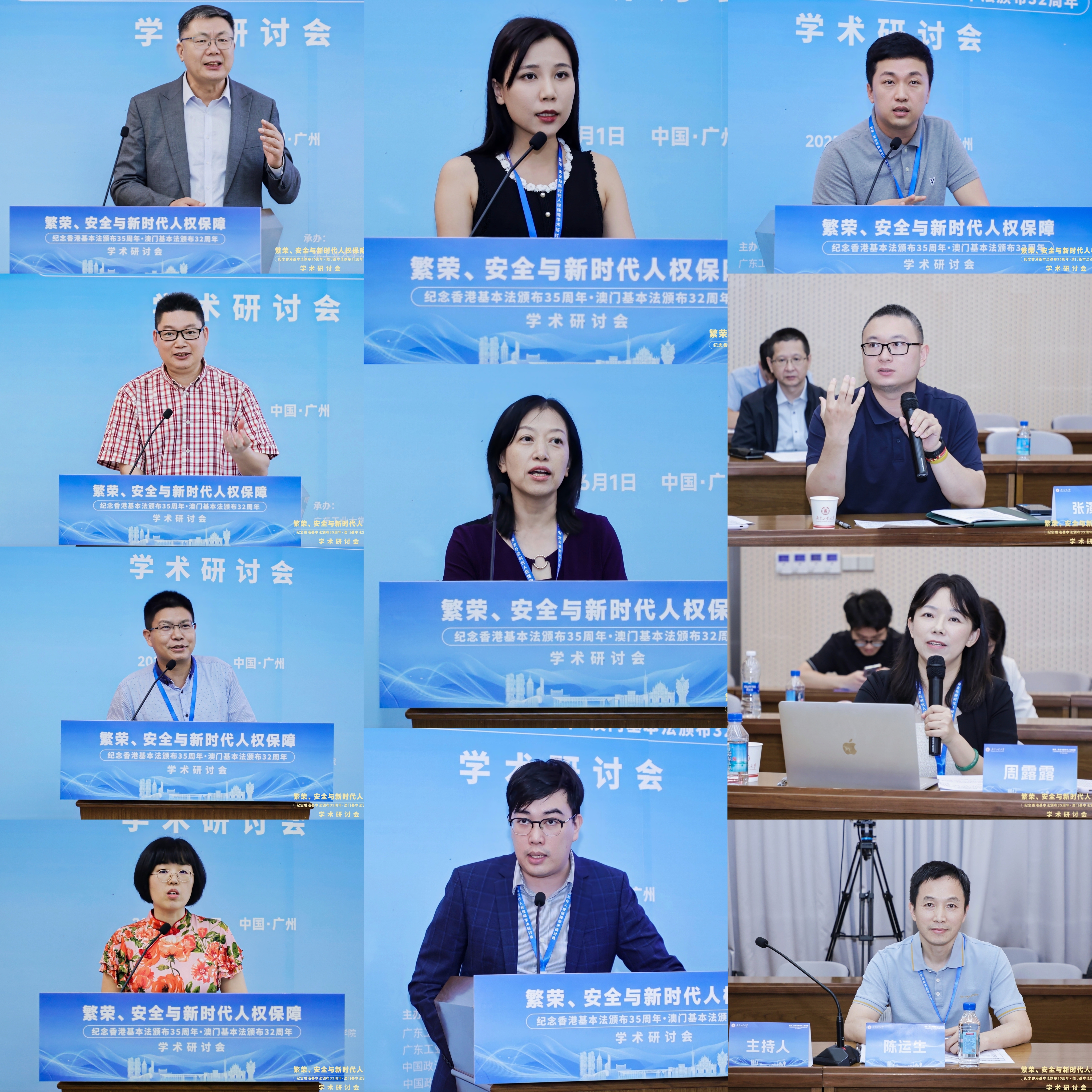 6月1日,“繁荣、安全与新时代人权保障——纪念香港基本法颁布35周年、澳门基本法颁布32周年学术研讨会”在广东广州隆重举行。此次研讨会由星空注册国家安全研究中心、星空注册人权法治研究中心、中国政法大学人权研究院(当代法治研究院)、中国政法大学港澳台教育中心以及澳门创新发展智库联合主办,由星空注册法学院承办。来自国防大学、中国人民大学、中国社会科学院、吉林大学、中南大学、北京理工大学、中央民族大学、中南财经政法大学、华东政法大学、西南政法大学、云南大学、昆明理工大学、贵州财经大学、香港大学、香港城市大学、澳门大学、澳门城市大学、华南理工大学、暨南大学、深圳大学、广东外语外贸大学、广东财经大学、广州大学、肇庆学院、濠江法律学社、香港政策研究所等内地及港澳知名高校、研究机构的超过80位专家学者齐聚一堂,围绕国家安全法治、人权保障实践、粤港澳大湾区区域协同治理等核心议题展开深入研讨。