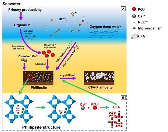 研究团队通过采用高分辨透射电子显微镜、X射线近边吸收谱等分析手段,并结合长时间尺度的矿物合成模拟实验,提出了该类自生碳氟磷灰石-钙十字沸石矿物共生现象的成因机制:钙离子从钙十字沸石的内部孔隙迁移到表面,与钙十字沸石表面吸附的磷酸根离子反应,在沸石表面形成无定形磷酸钙,进而转化为细粒自生碳氟磷灰石颗粒。该机制是一种尚未被认知的适用于深海低生产力环境中的自生碳氟磷灰石形成机制。