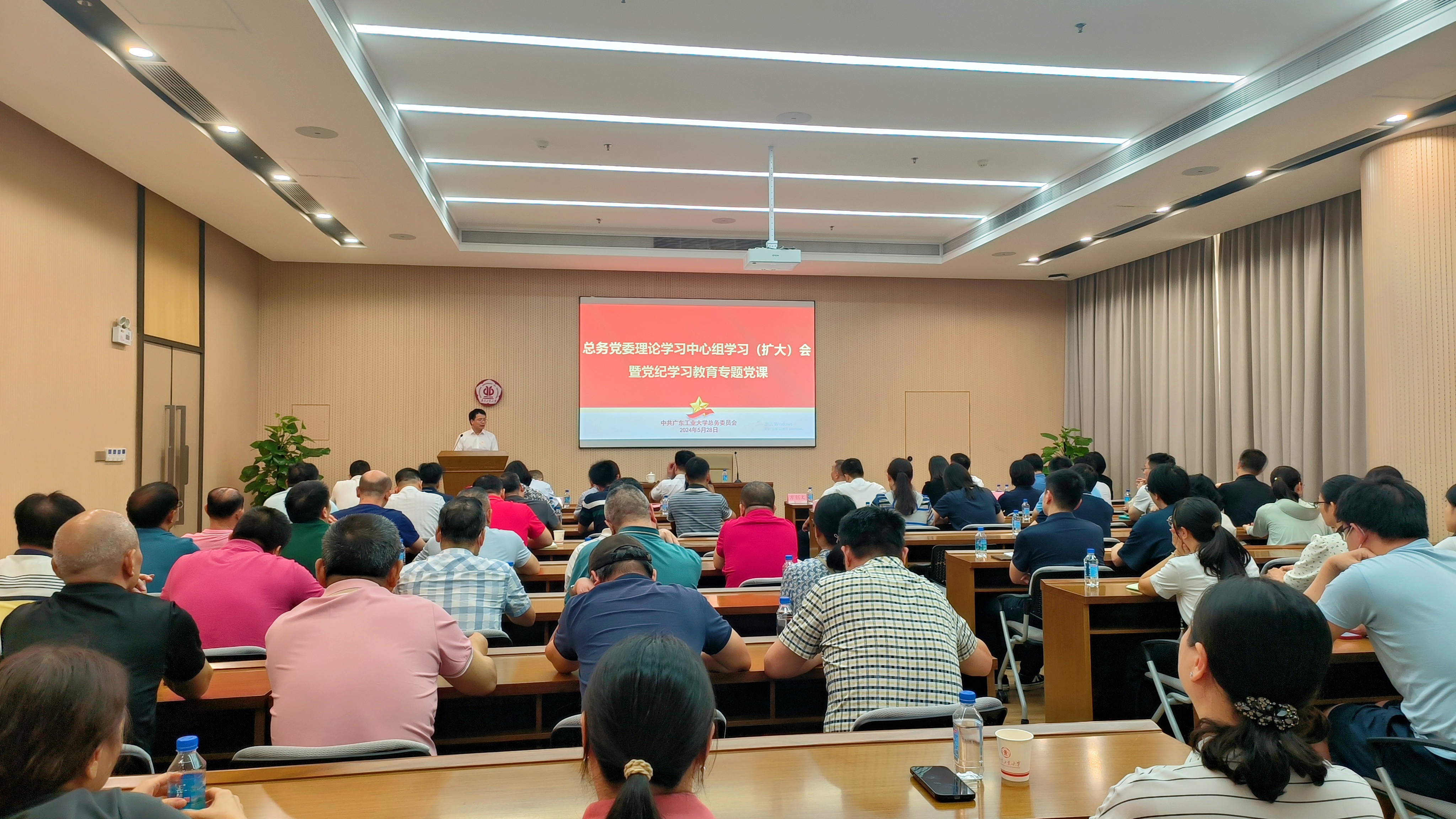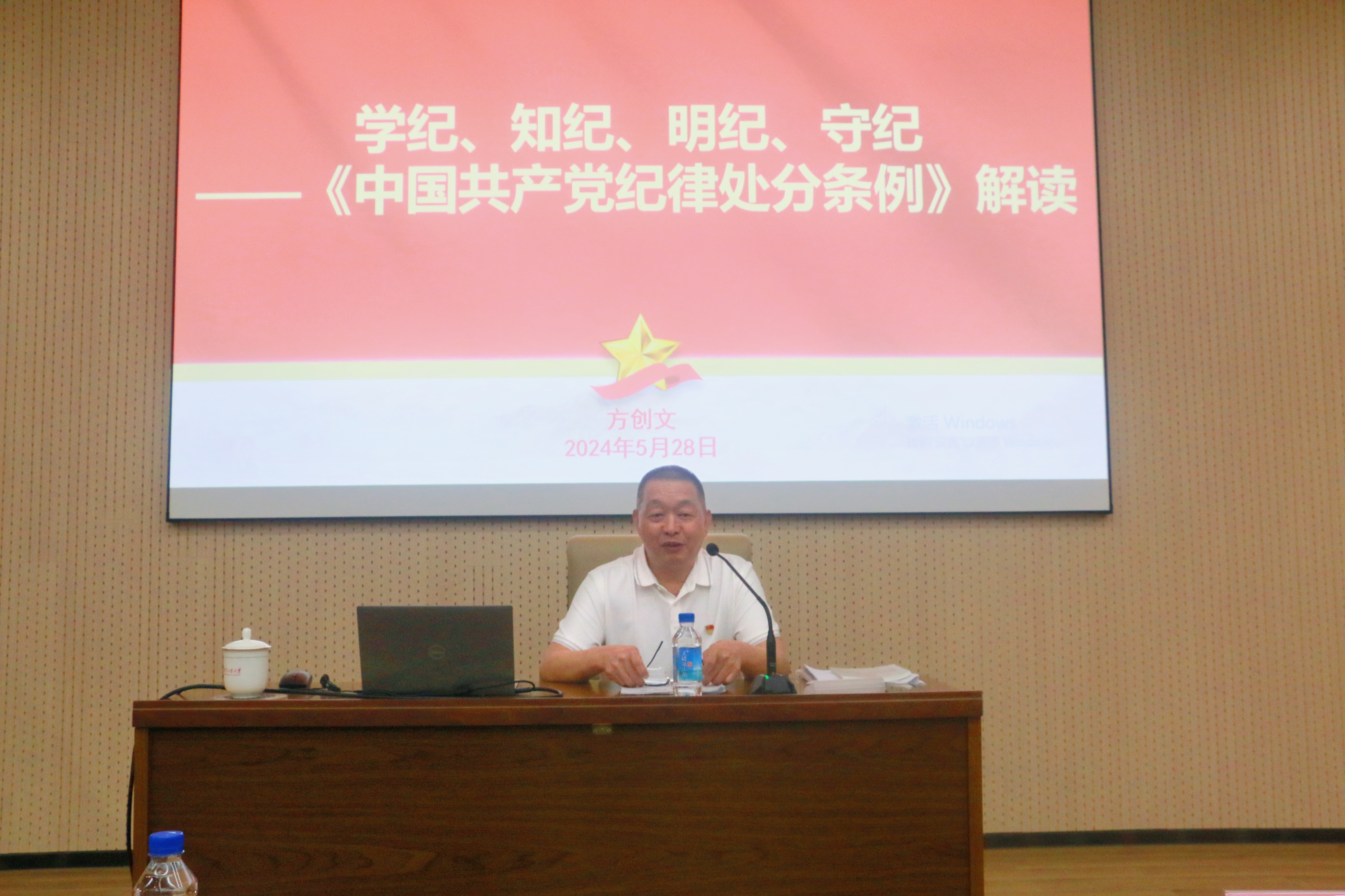 深入学习贯彻习近平总书记关于党纪学习教育的重要讲话和重要指示精神,推动党纪学习教育走深走实。5月28日,总务党委举行理论学习中心组学习(扩大)会,邀请学校纪委副书记、纪检监察室主任方创文讲授党纪学习教育专题党课。纪检监察室副主任、纪委办公室副主任(兼)雷颂勤,总务全体党员、主管(主任)以上干部参加会议。会议由总务党委书记朱可峰主持。