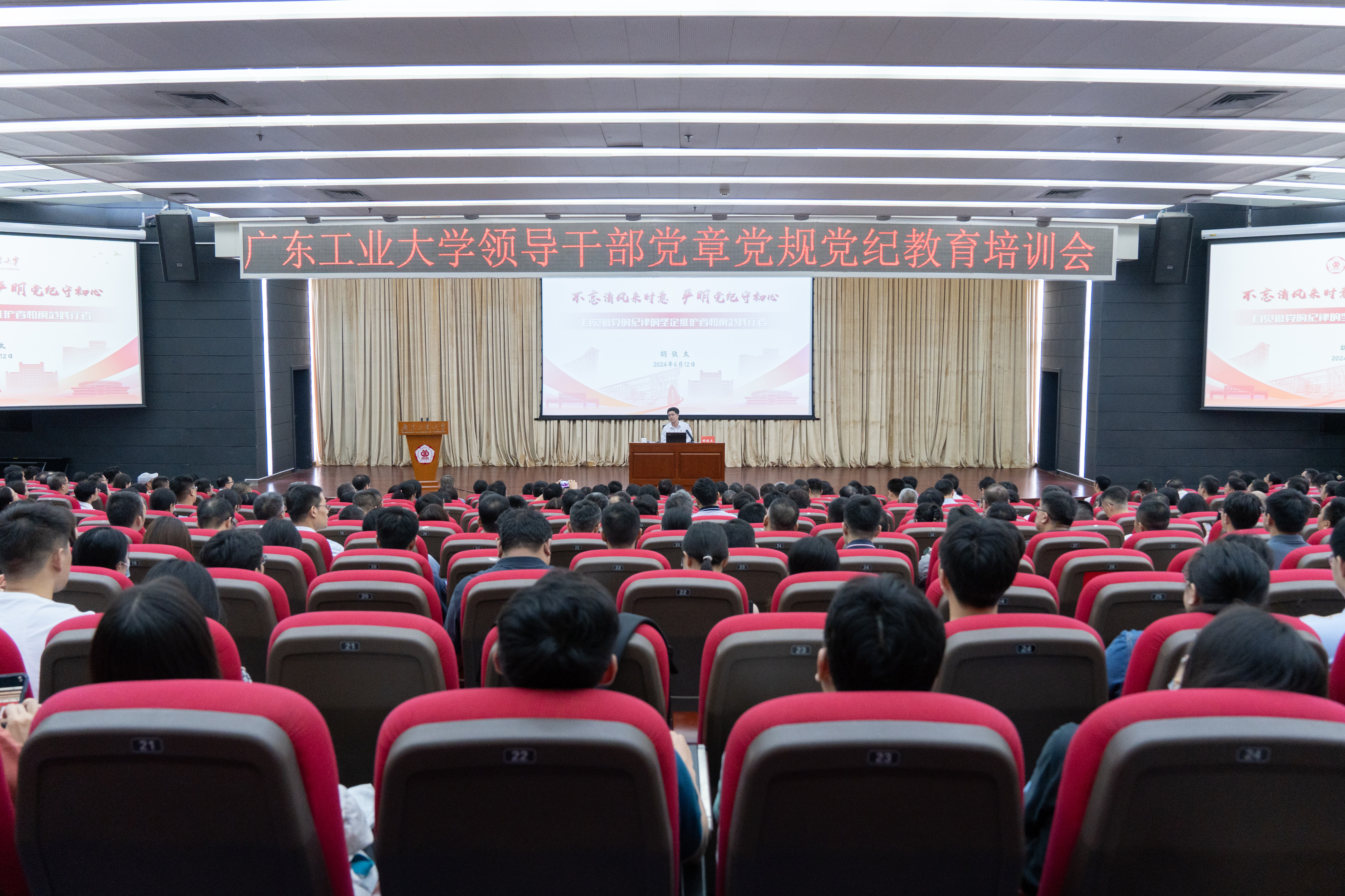 6月12日下午,学校举办全校领导干部党章党规党纪教育培训会,学校党委书记、党校校长胡钦太为全校中层党员领导干部、全体党支部书记共500余人讲授纪律党课。学校党委副书记、党校副校长陈良友主持会议。党委常委、纪委书记、广东省监委驻星空注册监察专员庞建国,党委常委、党委宣传部部长张育广参加会议。